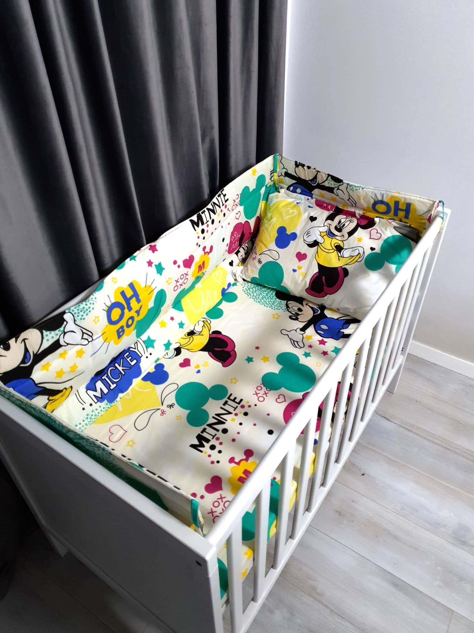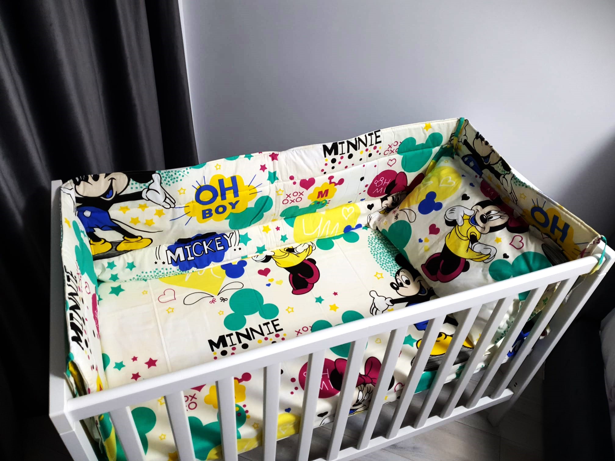 –Protectii de pat model Mickey Mouse, lungime laterala de 120 de cm si doua capete de 60 de cm, atat pentru protectia capului cat si a picioarelor. 60x120x60 cm , si inaltimea acestuia de 50 de cm.